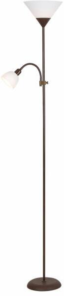178 cm magasságú, időtlen stílusú állólámpa olvasókarral, barna színű fém szerkezettel és fehér színű, műanyag lámpabúrákkal, külön kapcsolható fényforrásokkal, hálózati kapcsolóval, vezetékkel. A felső lámpatest E27-es foglalatkialakítású, maximum 100W teljesítményű, az olvasókar E14-es foglalatkialakítású, maximum 25W teljesítményű, halogén vagy LED fényforrásokkal is használható. Kialakításának köszönhetően a fényforrások cseréje, illetve a lámpatest tisztítása gyorsan és egyszerűen elvégezhető.